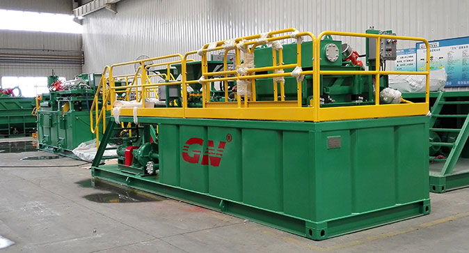 本套系統分為2個階段的固控處理和一套泥漿配置混合系統。鉆井泥漿初步分離采用的是冠能GNZS752型振動篩,200GPM的處理能力、兩片篩網的構造用來處理鉆井泥漿中的大顆粒的固體。振動篩處理后的液體通過離心泵輸送給迷你型的沉降離心機GNLW223進一步處理,可達3800RPM的轉速,分離的固體顆??蛇_到2個微米。