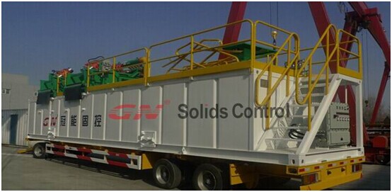 冠能150GPM泥漿系統(tǒng)配置如下 1、1臺GNZS703D雙層振動篩上安裝了3個4寸除泥旋流器,通過GNZS703D雙層篩可以把粗砂除去,然后通過除泥旋流器把20um左右以上的顆粒在分離除去, 2、2臺GNSB4X3-12J的砂泵安裝在泥漿罐斜倉上,1臺用于給除泥器供漿,另外1臺作為混漿泵使用。 3、4米長的泥漿罐,非常緊湊的設(shè)計跟合理的布局,對于狹小的鉆井空間非常適宜。