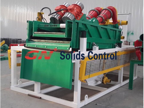 在鉆井現(xiàn)場兩臺 GNZS853 140m³/h處理量的鉆井液振動篩分離回收鉆井泥漿中大量的固相顆粒。一臺除砂除泥器一體機(GNZS853-3S16N,3個除砂旋流器和16除泥旋流器)分離比較小的固相顆粒。通過凈化的鉆井泥漿,達到了很好的凈化效果。 作業(yè)現(xiàn)場臥螺離心機安裝在泥漿罐上用來控制在鉆井地層發(fā)生變化時回鉆泥漿的穩(wěn)定性,同時可以根據(jù)現(xiàn)場需求配備不同比重的泥漿。